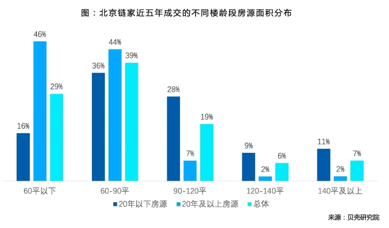 老旧小区居住空间普遍逼仄,环境配套较差。从贝壳近五年的成交数据看,北京楼龄在20年及以上的房屋中46%面积在60平以下,90%在90平以下,120平以上的占比仅4%。老旧房屋居住空间普遍拥挤。