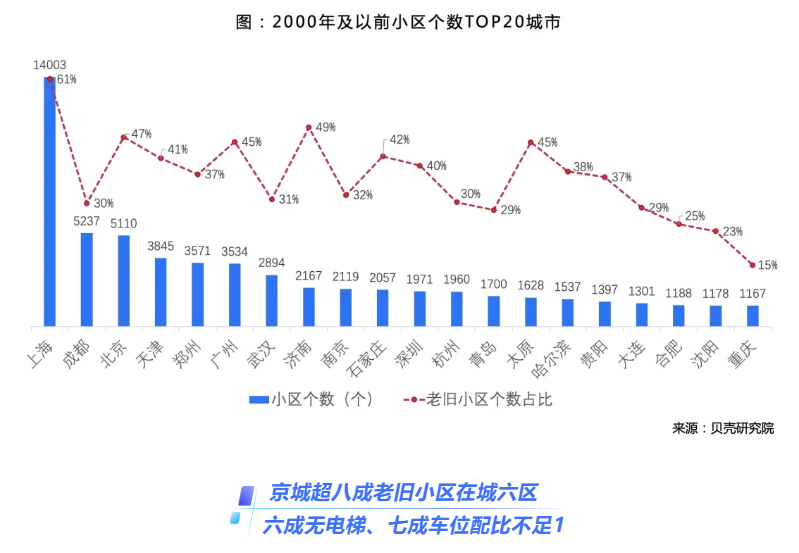按照住建部标准,全国需改造的老旧小区达到17万个,涉及建筑面积40亿平米。根据贝壳楼盘字典数据,重点20城市(名单如下图)的记录小区数量为15.39万个,其中楼龄20年以上的老旧小区数量为5.96万个,老旧小区的占比近40%。