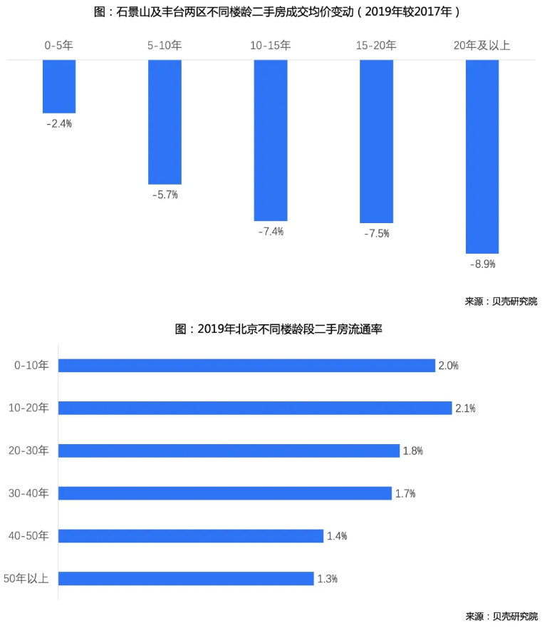 老旧小区房价抗跌性差且流通不畅。在本轮下行周期中楼龄偏大又无其他资源的石景山区以11%的累计跌幅(2019年较2017年)居北京城区房价跌幅前列。在保证样本的前提下,为了剔除教育资源的影响,以石景山及丰台两区房源为样本,房价跌幅与楼龄基本呈正相关:20年及以上的房源均价累计跌幅达9%,而楼龄在5年以内次新房价格跌幅不到3%。房源老旧、居住环境差制约房屋的流通。房龄越大,流通率越低,不利于资源的优化配置。