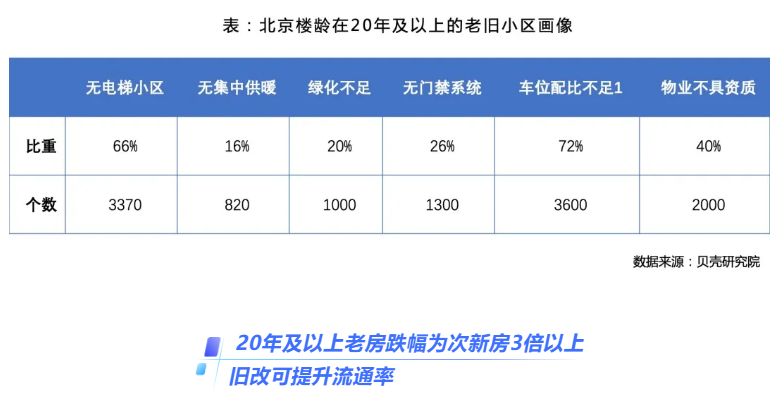 北京的老旧小区主要在核心区域,地段价值高,但是目前居住条件差,导致老旧小区在下行周期房价跌幅更大,造成了难以流通和资源被浪费的恶性循环。