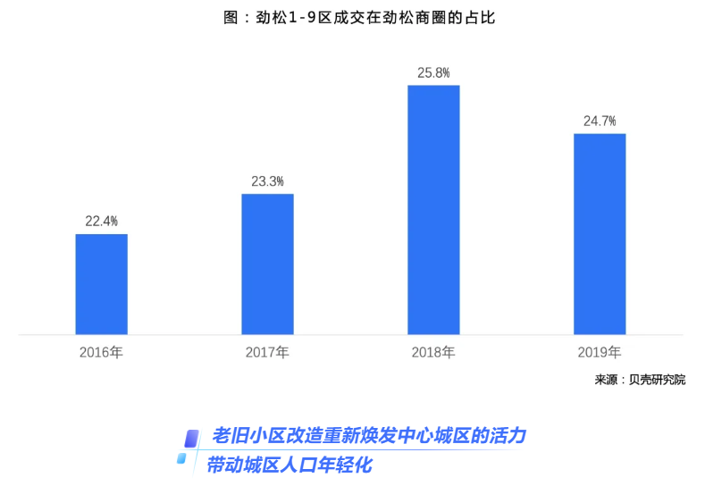 老旧小区改造提升小区流通率。以朝阳区劲松商圈为例,近两年进行了大面积改造,社区价值的提升作用明显。2018年劲松商圈二手房成交均价同比下跌9.3%,2019年均价止跌转涨,涨幅排在朝阳区61个商圈中第13位。劲松商圈二手房成交体量在61个商圈中排名由2016-2017年第10位前进2名,2018-2019年稳定在第8位。