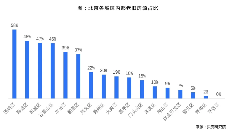根据贝壳楼盘字典数据,北京楼龄在20年以上的老旧小区数量5100个左右,涉及243万套住房。从区位分布看,北京所有存量住宅房源中有64%分布在城六区,而老旧小区房源中,有82%集中在城六区。西城区内部老旧房源占比高达58%,位于各城区首位,海淀、东城及石景区域内老旧房源占比在47%左右。